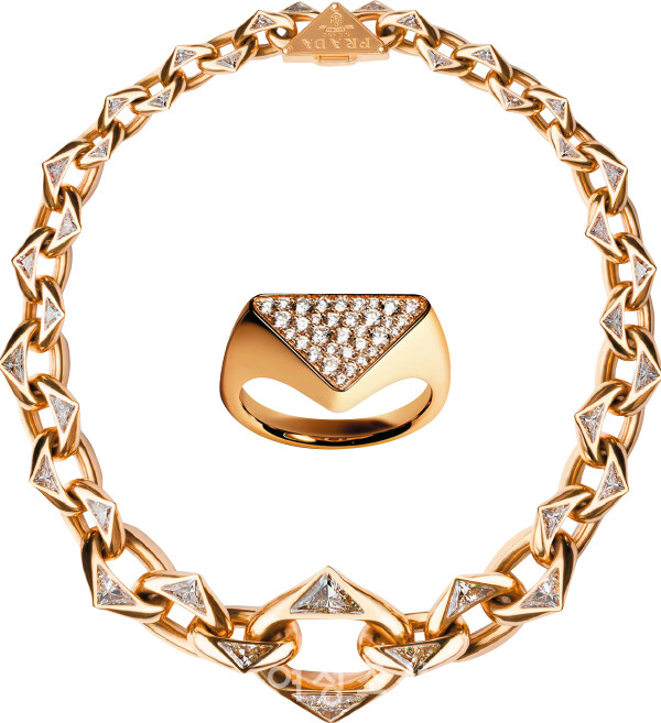 이터널 골드 체인 네크리스, 프라다 프라다 컷이라고 이름 지어진 세모 형태의 랩다이아몬드가 옐로 골드와 결합된 체인 형태의 네크리스. 총 40.2캐럿의 랩다이아몬드가 세팅되어 있다. 가격미정.