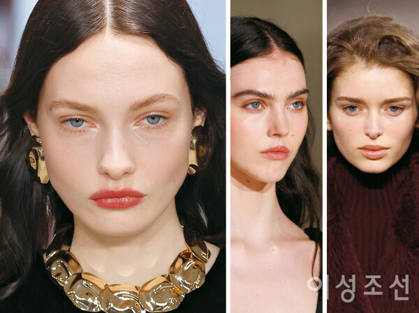 얼굴의 선을 바꾸기보다 본래 구조가 가진 흐름에 집중하자. 차분한 럭셔리의 핵심은 드러내기보다 숨기고 절제하는 데서 완성된다. 광대 아래와 사선 페이스 라인, 관자놀이에 얇게 스며드는 음영은 얼굴이 지닌 본연의 온도를 되살려준다. 특히 얇은 혈색 블러셔와 경계 없이 이어지는 셰이딩은 FW 메이크업의 가장 섬세한 디테일로 꼽을 수 있다. 과하게 조각된 느낌 없이 손대지 않은 완성도에 집중하기 때문에 하나의 미묘한 흐름으로 번지게 스머징하는 방법이 포인트다.