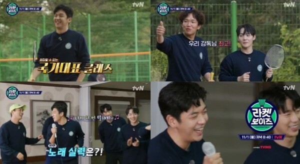 스파르타 훈련 뒤에 MT의 꽃 ‘바비큐’가 걸린 노래방 점수를 놓고 라켓보이즈와 제작진이 신경전을 벌인다. 윤두준, 세븐틴 승관, 이찬원, 정동원 등 음악방송이 부럽지 않을 화려한 라인업을 보유한 라켓보이즈. 하지만 공개된 예고편 속 마이크를 잡은 이용대 감독의 놀라운 ‘생목’ 열창이 동공지진을 일으킨다. 주장 윤현민의 숨겨진 노래실력도 공개된다. 평소 좋아하던 임영웅의 ‘이제 나만 믿어요’를 선곡한 윤현민, 깜짝 놀랄 반전 실력을 뽐내며 맴버들을 놀라게 한다고. 정동원과 이찬원도 ‘엄지척’을 들었다.