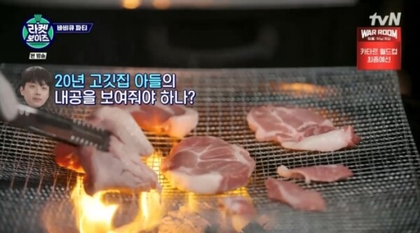 준비된 돼지고기 목살, 삼겹살과 대하를 본 이찬원은 "20년 고깃집 아들의 내공을 보여줘야 하나"고 자신감을 드러내며 고기를 굽기 시작했다. 잘 구워진 목살을 보고 이찬원은 "목살 너무 맛있어보이지 않느냐"고 물었다. 장성규도 "너무 잘 구웠다"며 인정했고, 멤버들은 "고깃집 아들은 다르다"고 칭찬했다. 이용대도 "찬원이가 구운 것 한번 먹어볼까"라며 고기를 먹고는 그 맛에 감탄했다.
