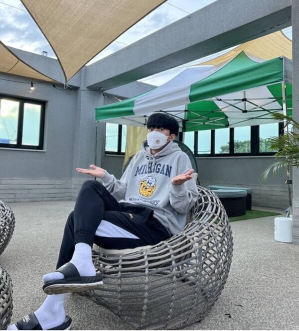 의자에 앉은 임영웅은 후디를 입고 마스크를 착용한 모습으로 ‘잘 모르겠다’는 제스처를 취하는 듯 양 손을 올리며 어깨를 으쓱여 보였다.