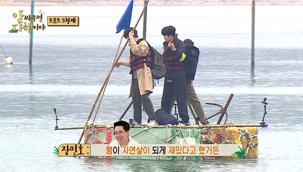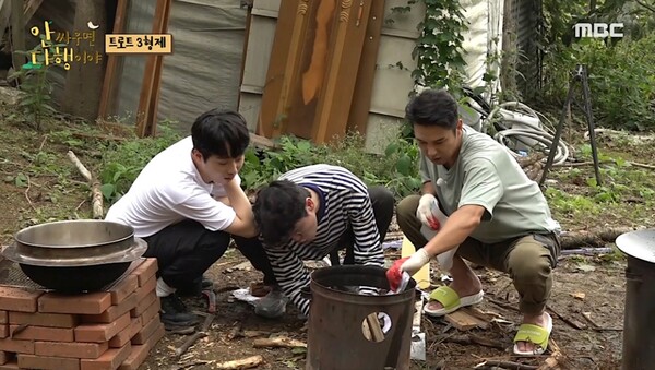 이날 트로트 3인방은 '안싸우면 다행이다' 최초로 뗏목을 타고 등장해 눈길을 끌었다. 영탁은 "와~ 이게 얼마만에 배 타는 거야"라며 신기해 했다. 섬에서 자급자족해야 하는 세 사람은 식재료 구하기부터 불피우기, 식사 준비 등을 하느라 지쳐 갔다.