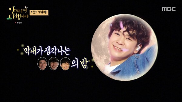 이찬원, 장민호, 영탁이 생애 처음으로 자급자족 여행을 떠났다. 15일 방송된 '안싸우면 다행이야'에서 장민호, 영탁, 이찬원은 비와 돌풍이 부는 험한 날씨로 요리하기 어려운 상황에 놓였다. 장민호는 "이렇게 가다가는 다음 끼니를 못 챙겨 먹을 수 있겠구나”라고 말했고, 이찬원은 "배가 너무 고프다. 최악이다"고 했고 영탁은 "우리 밥먹은지 얼마나 지났냐. 왜 이렇게 배가 고픈거냐"며 울먹였다.